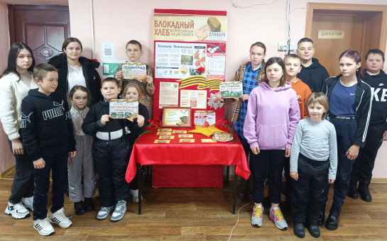 В знак памяти и уважения к подвигу ленинградцев посетители нашего учреждения могут взять себе кусочек ржаного, вкусного хлеба, разложенного на столе у стенда.